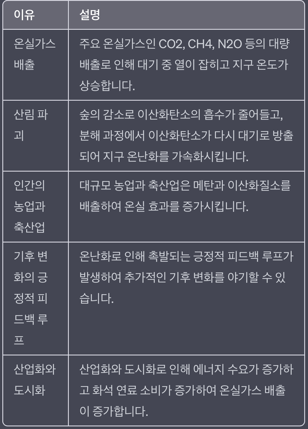이러한 요인들이 함께 작용하여 지구 온난화를 가속화시키고 있으며, 이로 인해 기후 변화와 여러 가지 문제들이 발생하고 있습니다.