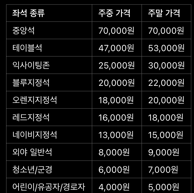 - 테이블석: 여유롭게 음식과 함께 관람 가능